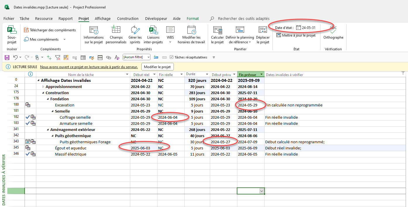 permet d'afficher la vue Vérifier Dates invalides pour retrouver facilement les dates invalides, donc non conforme d'une mise à jour en fonction de la date d'état du fichier.